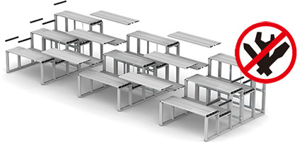 イベント開催時に金属音である“キシキシ”“カタカタ”と音が鳴ってはイベントが台無しです。弊社ではそういった音がしないように天板・段板には固定ゴムを装着し、脚部の上部全面に接触音やガタつきなどを防止するためのシートゴムを装着しているので“キシキシ”“カタカタ”といった音は一切しません。また、屋内・屋外でも使用していただけるよう床との接地面には、コーナーゴムを装備しておりフローリング・ピータイルなど傷つきにくい仕様にしております。
