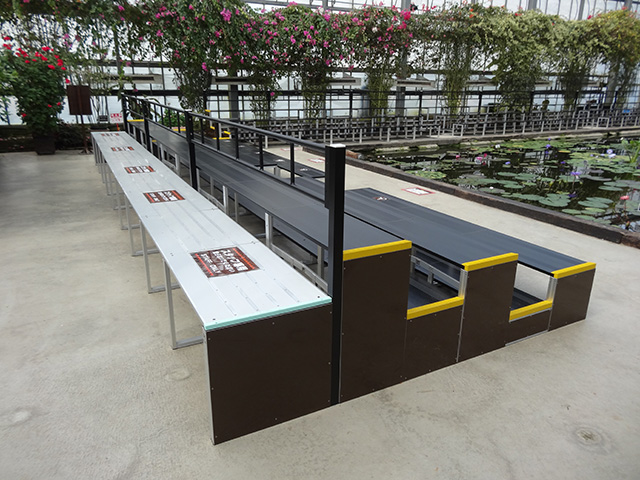 - 今までは木製のベンチを使用されていたが、来園者増加のため、多くの人が座れ、かつ、安全な観覧席を探されていました。