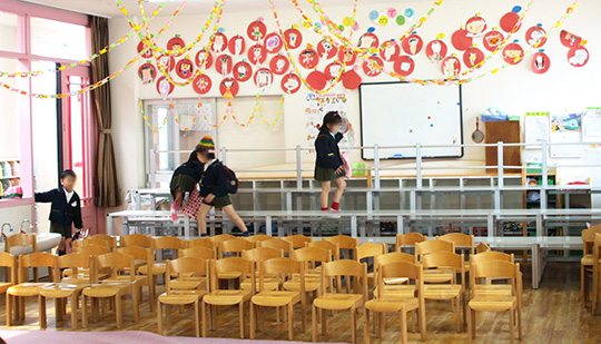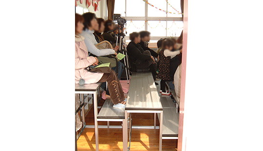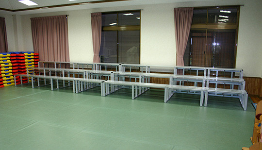 ある時、職員会議で「来園頂く保護者様により良い環境で発表の場を観覧して頂けないか」との意見から、アルミ観覧席を導入いたしました。